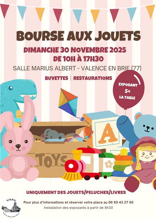 Salle des fêtes Place de l'église, Valence-en-Brie, Seine-et-Marne, FranceL'association V.A.A.V organise une "Bourse aux Jouets" le dimanche 30 novembre de 10h à 17h30, à la salle des fêtes Marius-Albert. Pour les exposants le tarif est de 05.00€ la table et il sera possible d'exposer uniquement des jouets, peluches et livres ! Pour plus d'informations et réserver votre place, contactez le 06.50.43.27.50. Installation des […]